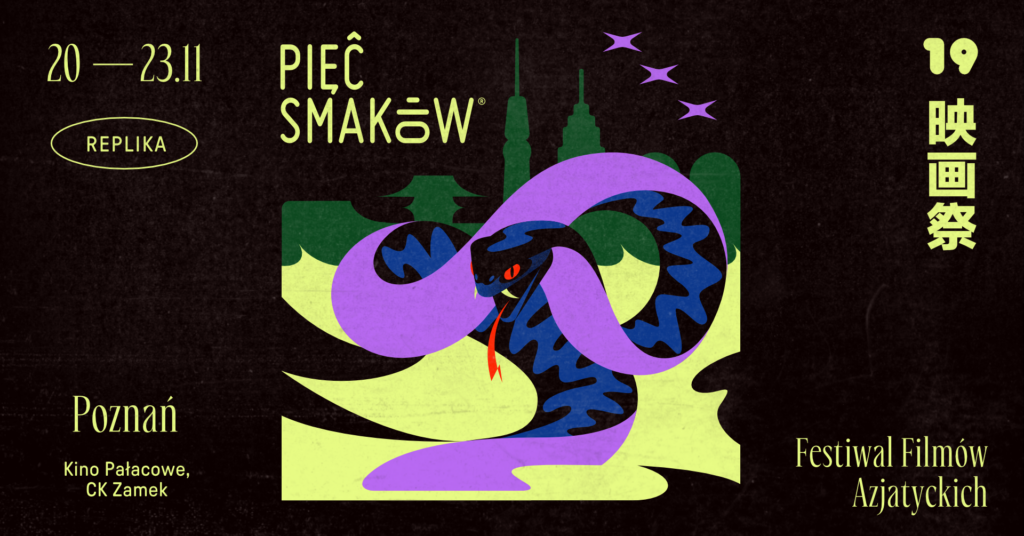 19. edycja Przeglądu Kina Azjatyckiego Pięć Smaków – święta kina azjatyckiego w Polsce – zawita w tym roku do Poznania! Festiwal odbędzie się w Kinie Pałacowym Centrum Kultury ZAMEK w dniach 20-23 listopada 2025 r. W tym czasie obejrzymy produkcje z różnych zakątków Azji Wschodniej i Południowo-Wschodniej, w tym z Korei Południowej, a po projekcjach wybranych dzieł widzowie będą mieli okazję spotkać się z twórcami i twórczyniami, którzy specjalnie w tym celu zawitają do Poznania. Na uczestników festiwalu czekają ponadto dyskusje, wykłady i prelekcje, mające na celu przybliżenie współczesnego oblicza kultur Azji.